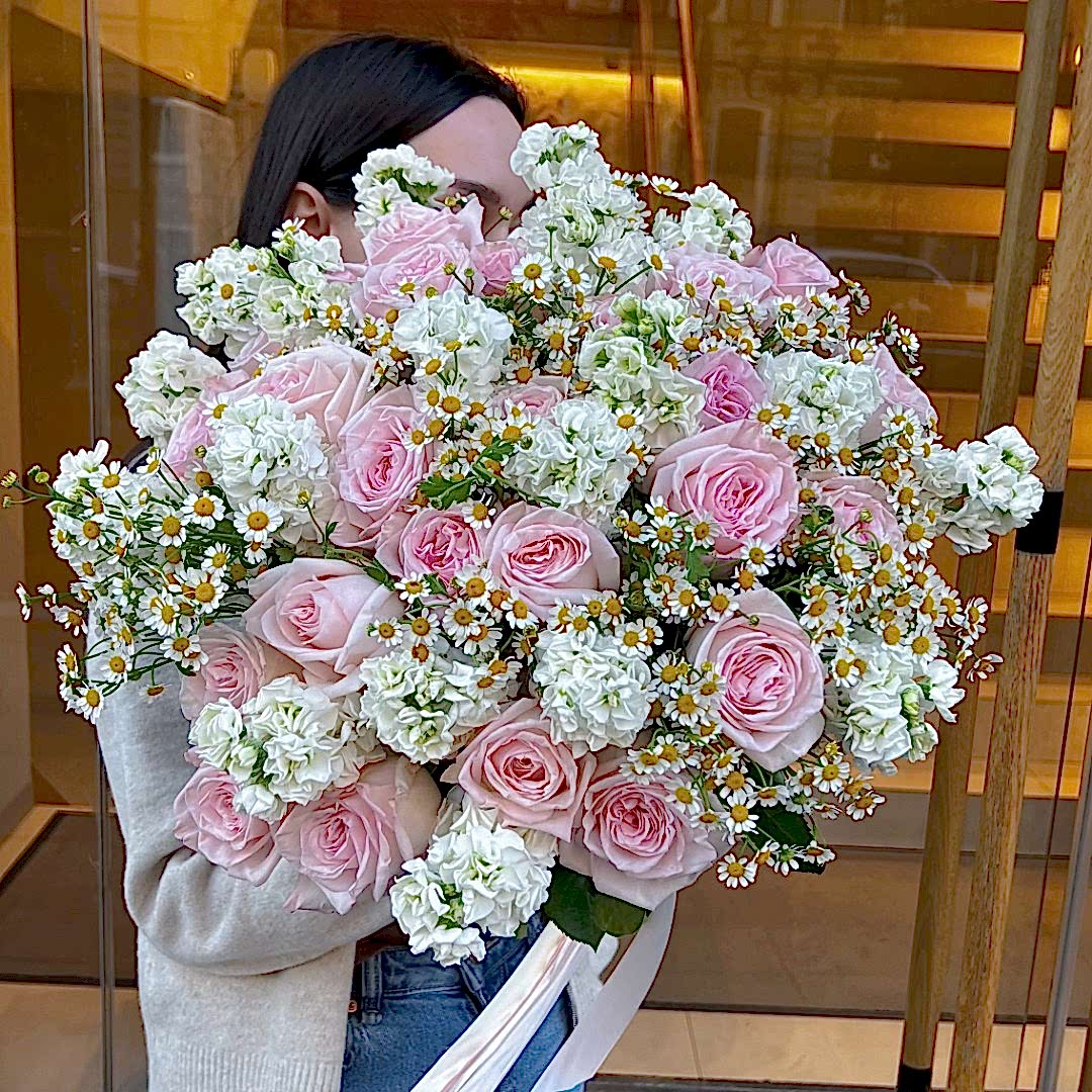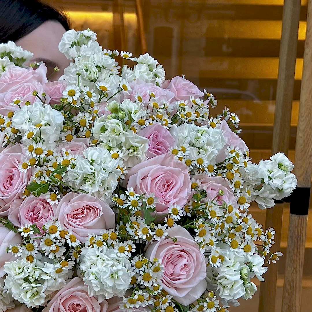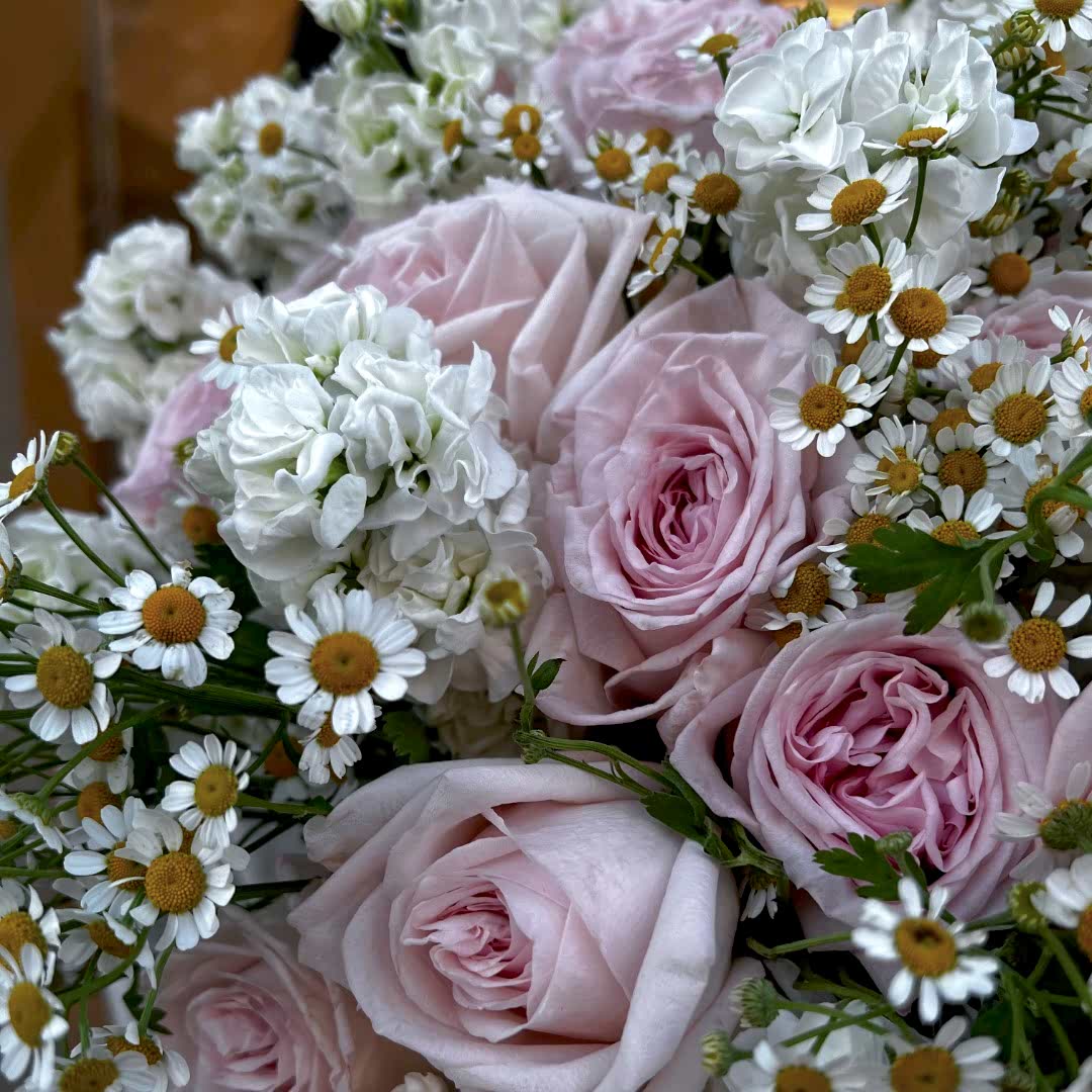Состав: роза сорта Пинк Охара, белая маттиола, матрикария.
