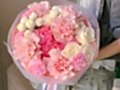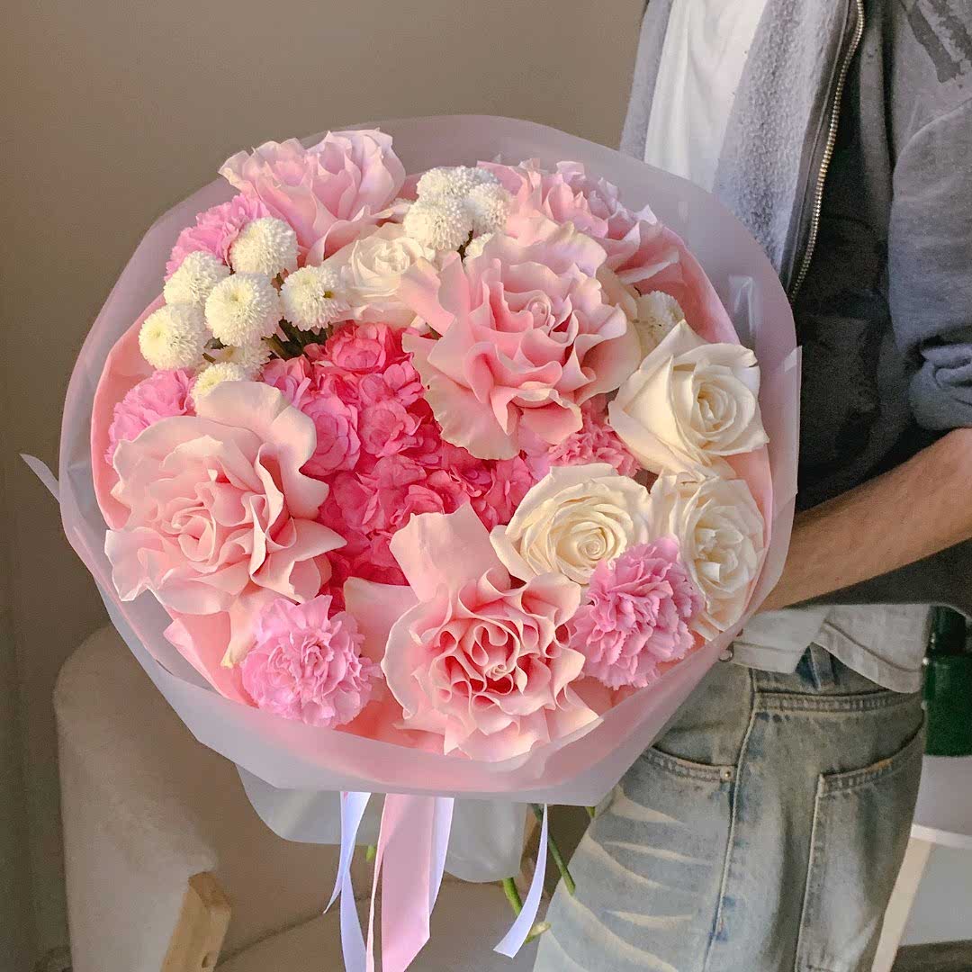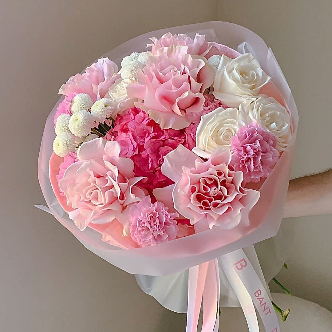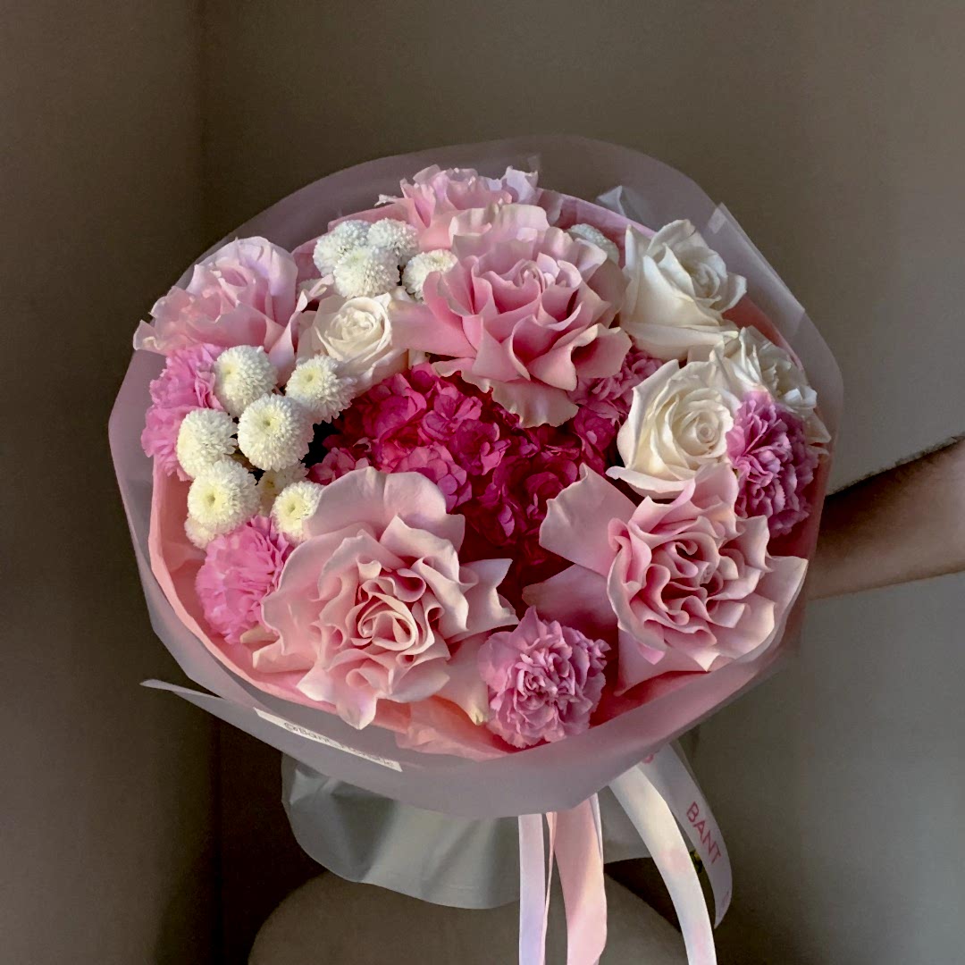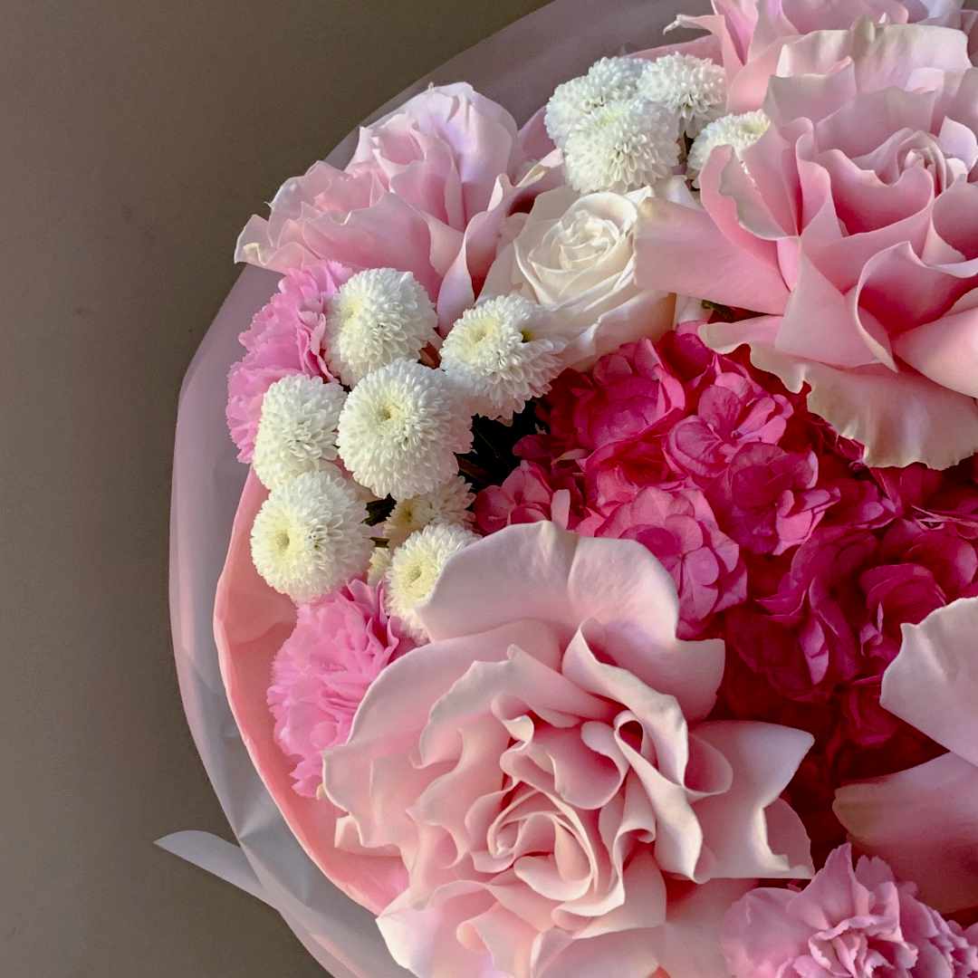 Состав: 5 роз сорта Пинк Мондиаль, 4 розы сорта Плая Бланка, 5 гвоздик сорта Донсел, 1 гортензия, 2 хризантемы сорта Сантини (на фото).
