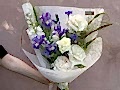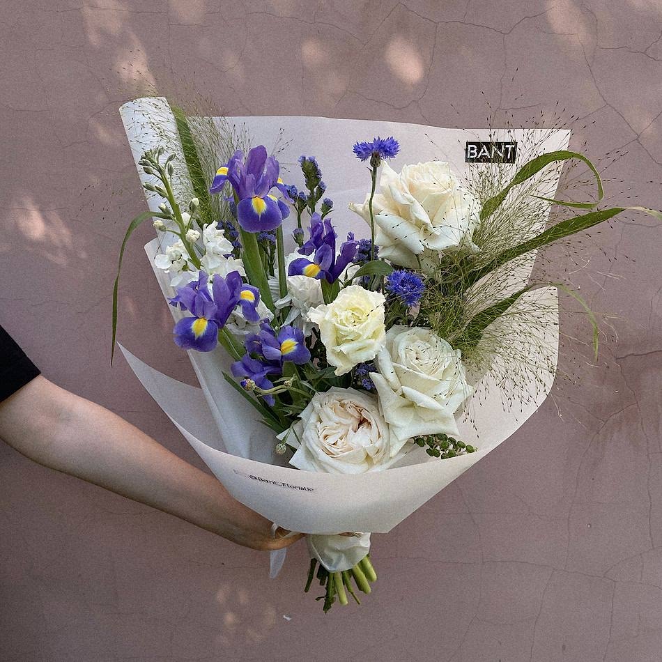 Нежный букет в природной палитре: изящные ирисы, ароматная маттиола, классические и пионовидные розы, воздушная статица, солнечные хризантемы, лёгкий паникум и трогательные васильки по сезону — гармония свежести и элегантности в каждом стебле.