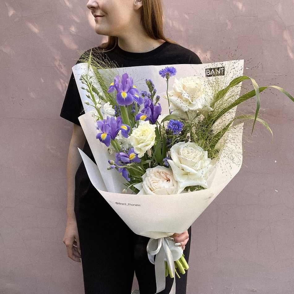 Состав: ирисы, маттиола, роза, роза пионовидная, статица, хризантема, паникум, васильки по сезону