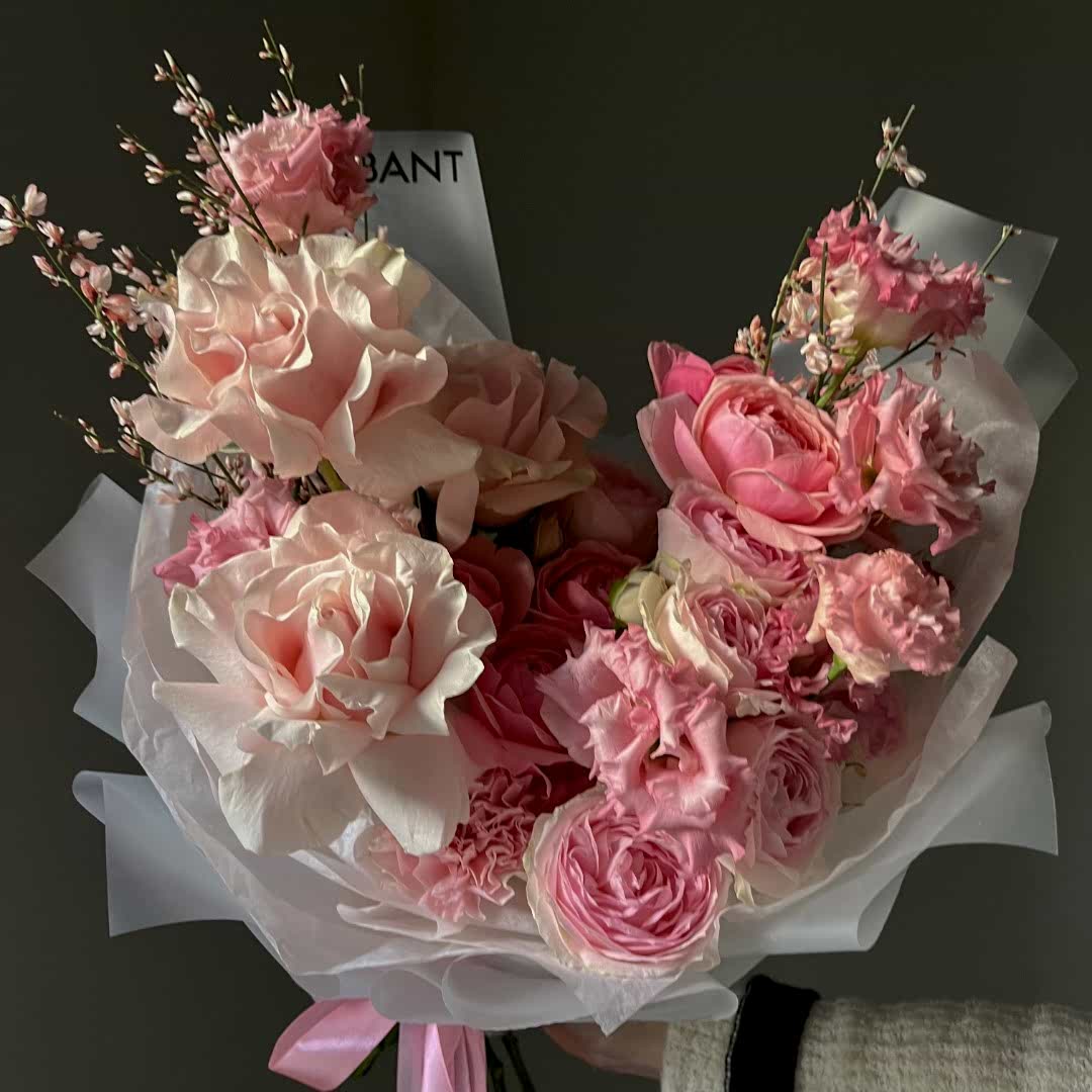 Состав: роза сорта Мондиаль, кустовая роза сорта Сильва Пинк, лизиантус розовый, гениста, диантус сорта Донсел.