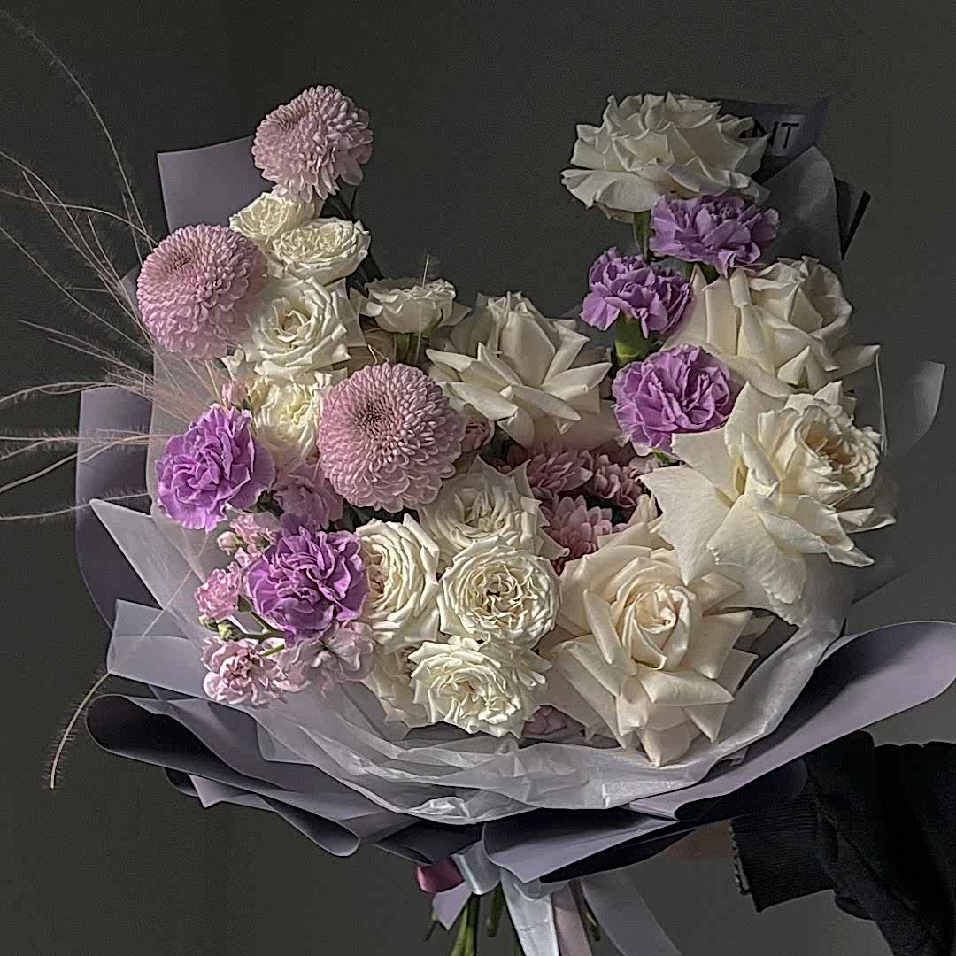 Состав: роза сорта Плая бланка, диантус сорта Мунаква, хризантема кустовая, Момоко хризантема одноголовая, кустовая Роза Джанин, маттиола.