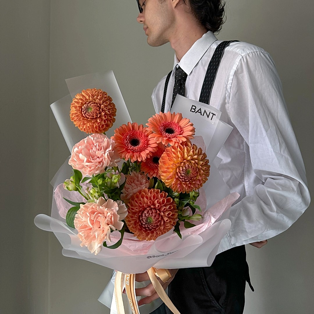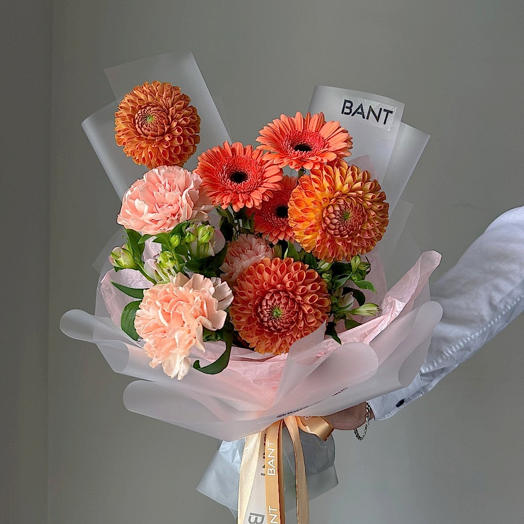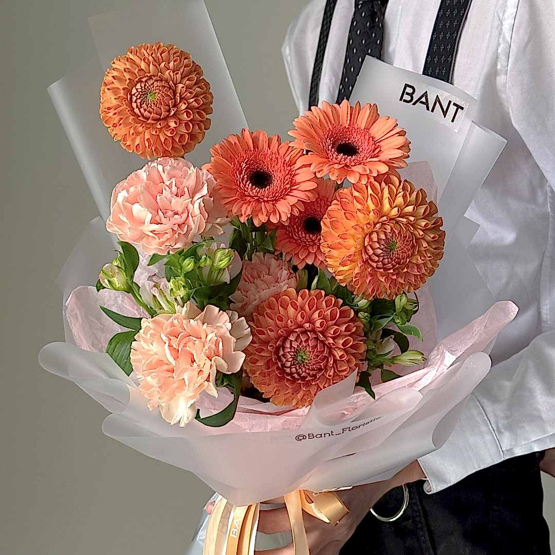 Состав: Георгины, альстромерия, диантусы, герберы.