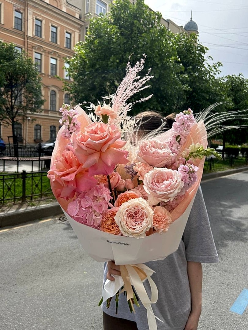 Состав: Пионовидныеи розы Тсумуги, кортадерия, Гортензия, диантусы, сухоцветы, маттиола, антиринум.