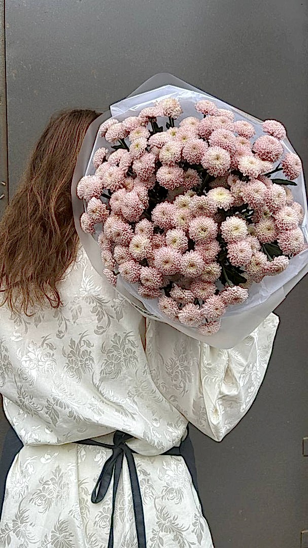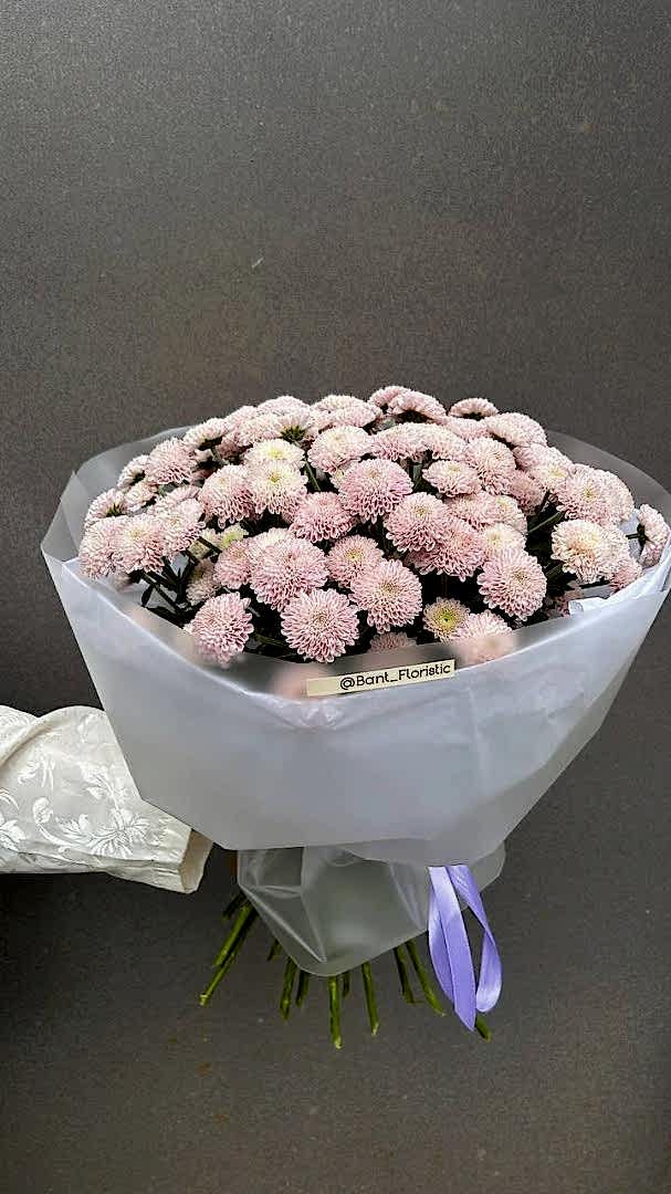 Монобукет из сезонной стойкой хризантемы нежно- розового оттенка.