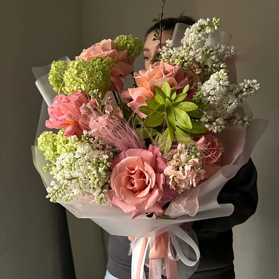 Состав: сирень, роза сорта Эрмоса, чойсия, коыль, веточки айвы, вибурнум.