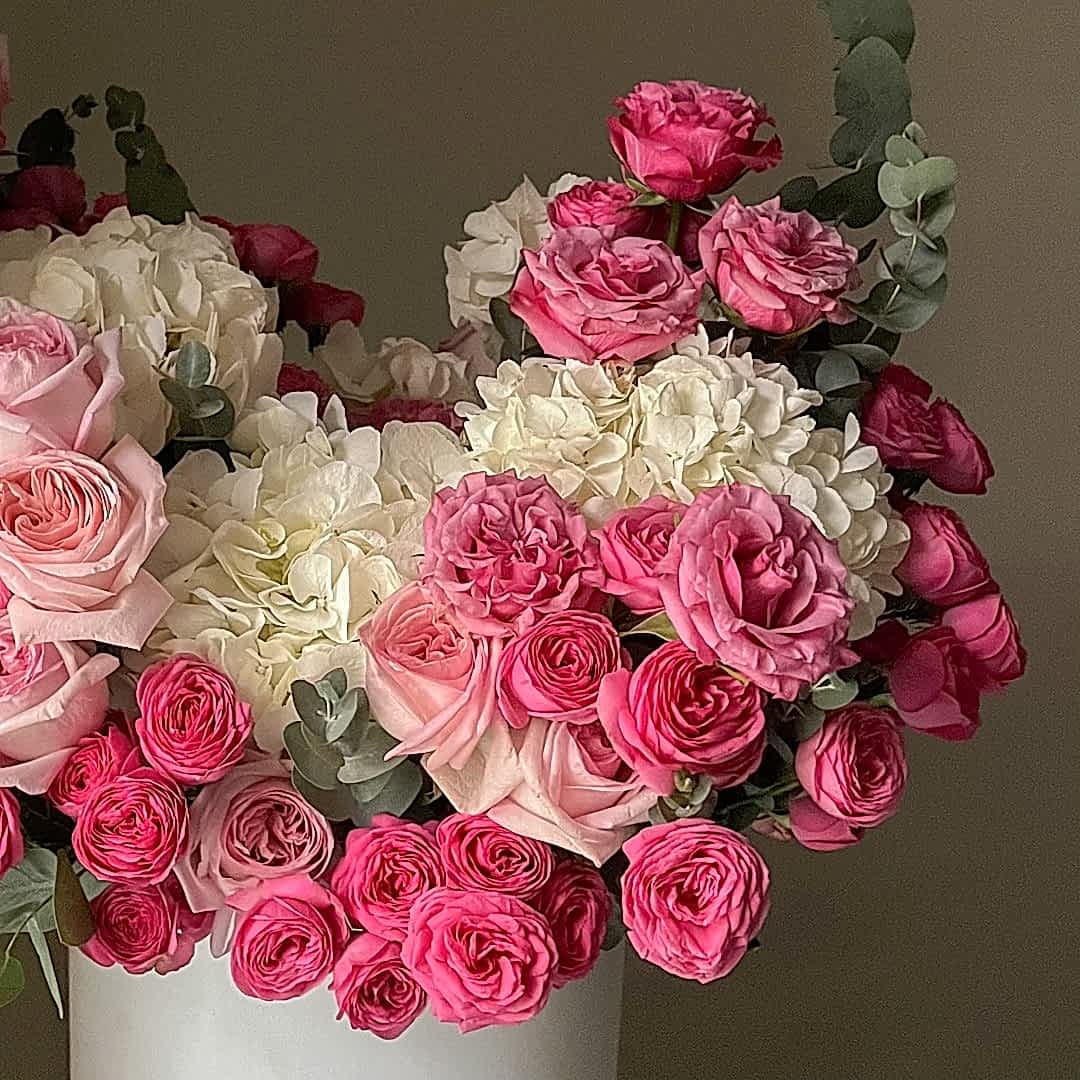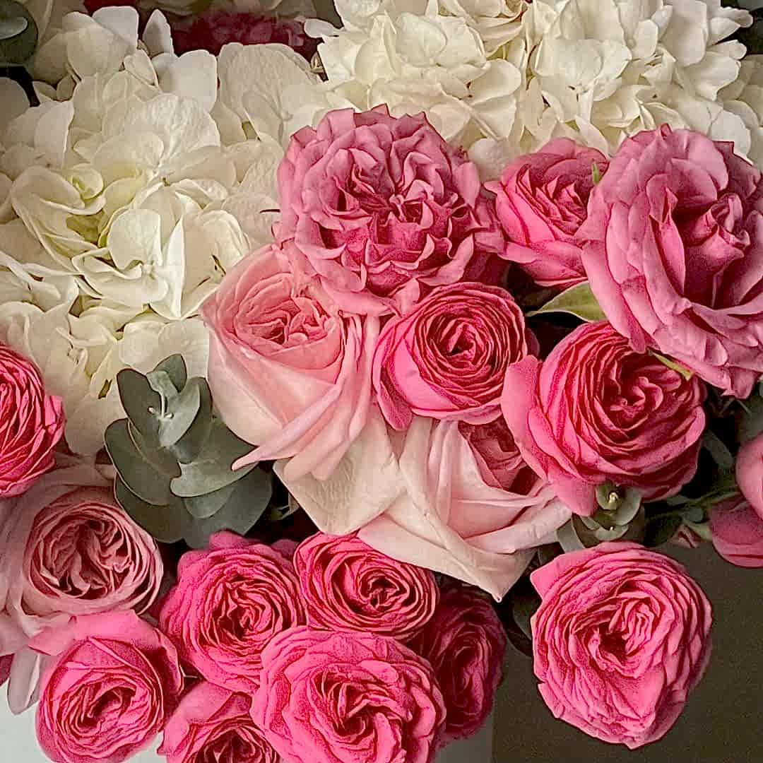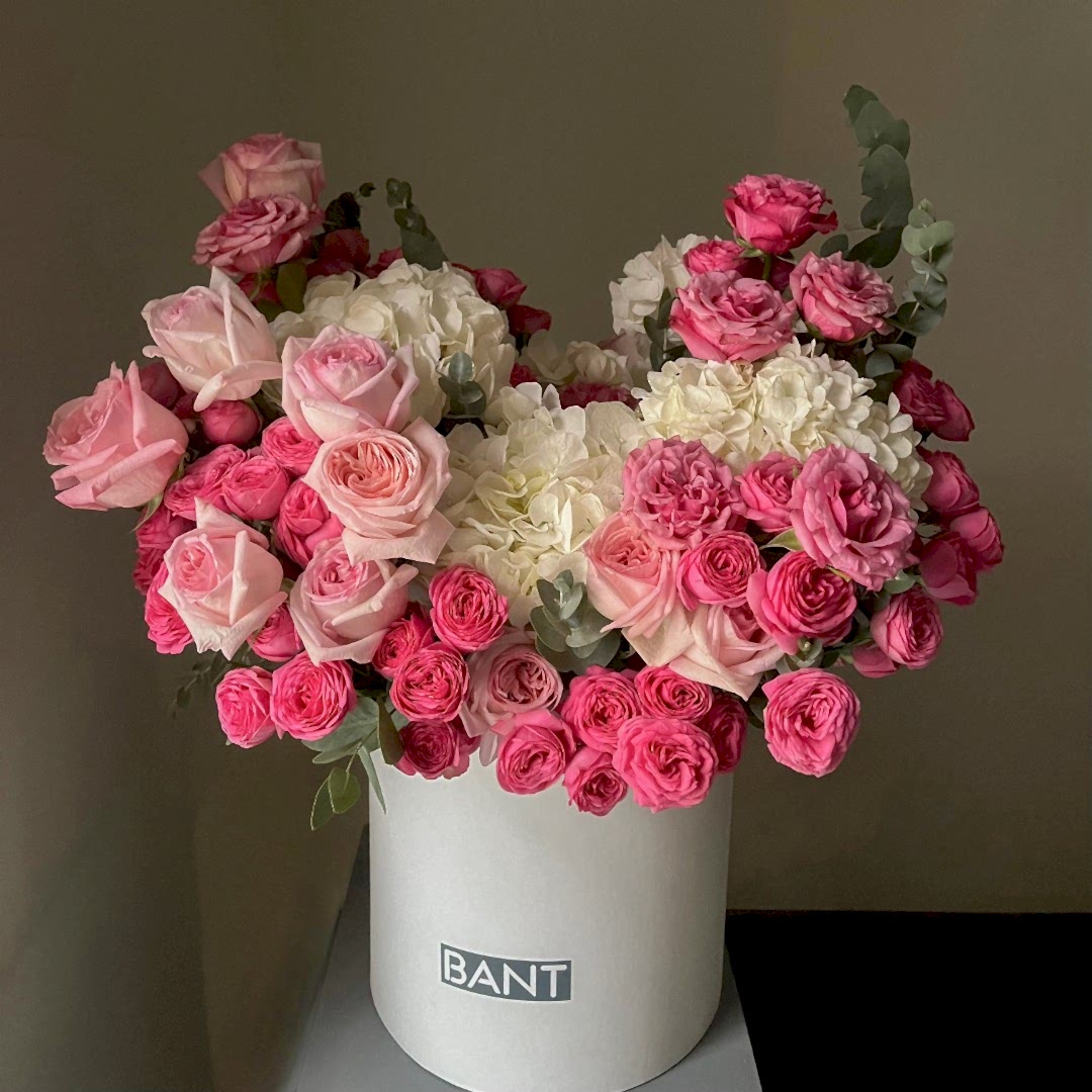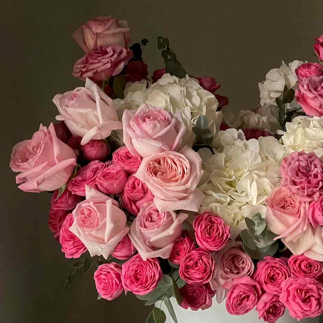 Роскошный букет в шляпной коробке из пионовидных роз и гортензий — это гармоничное сочетание нежности и изысканности. Пышные розы и воздушные соцветия гортензии создают объёмную композицию, которая поражает своей красотой. Идеальный подарок для самых торжественных случаев или чтобы подчеркнуть важность момента.