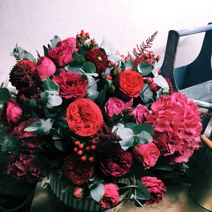 Эффектное сочетание пионовидных роз и пышных шапок гортензии. Очень сочное ассорти ягодных оттенков!