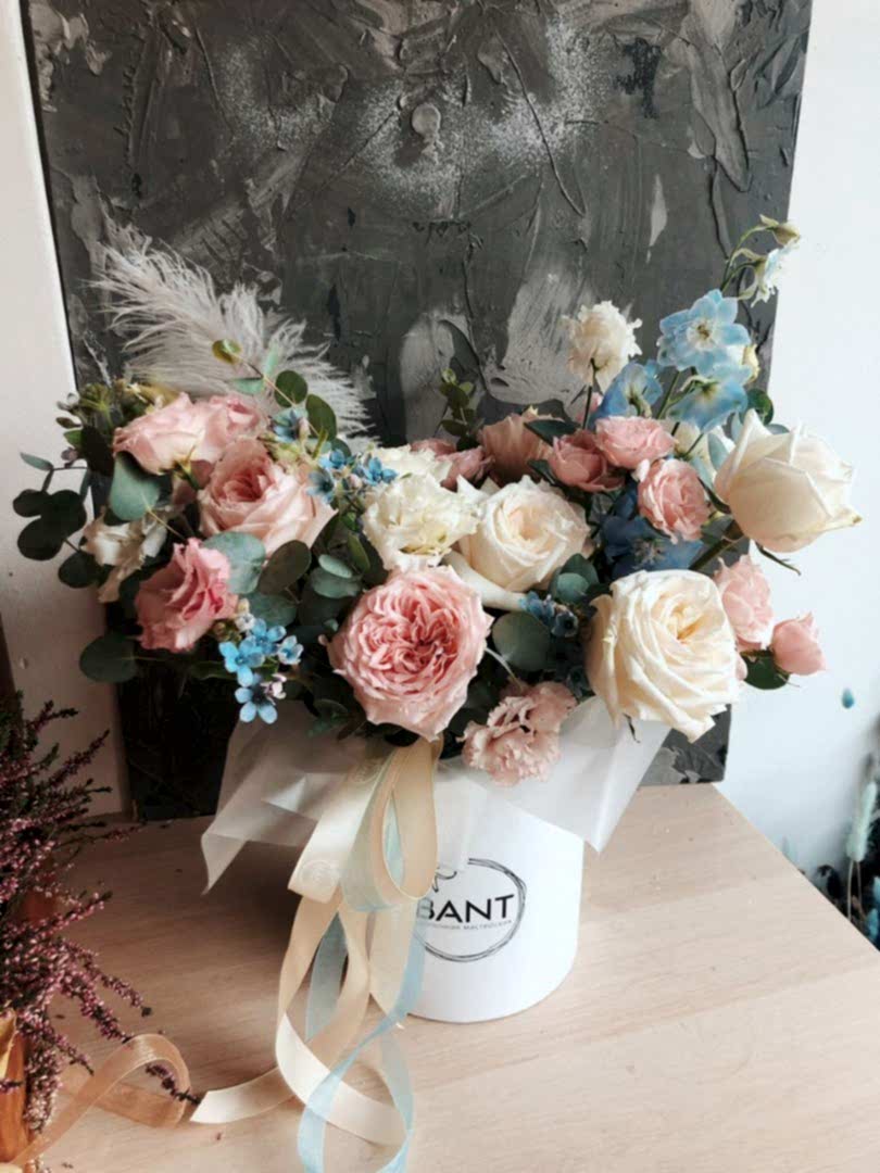 Состав: пионовидная роза цумуги, пионовидная роза вайт охара, кустовая роза пинк майолика, Эустома, оксипеталум голубой, дельфиниум голубой, белое перо, эвкалипт.