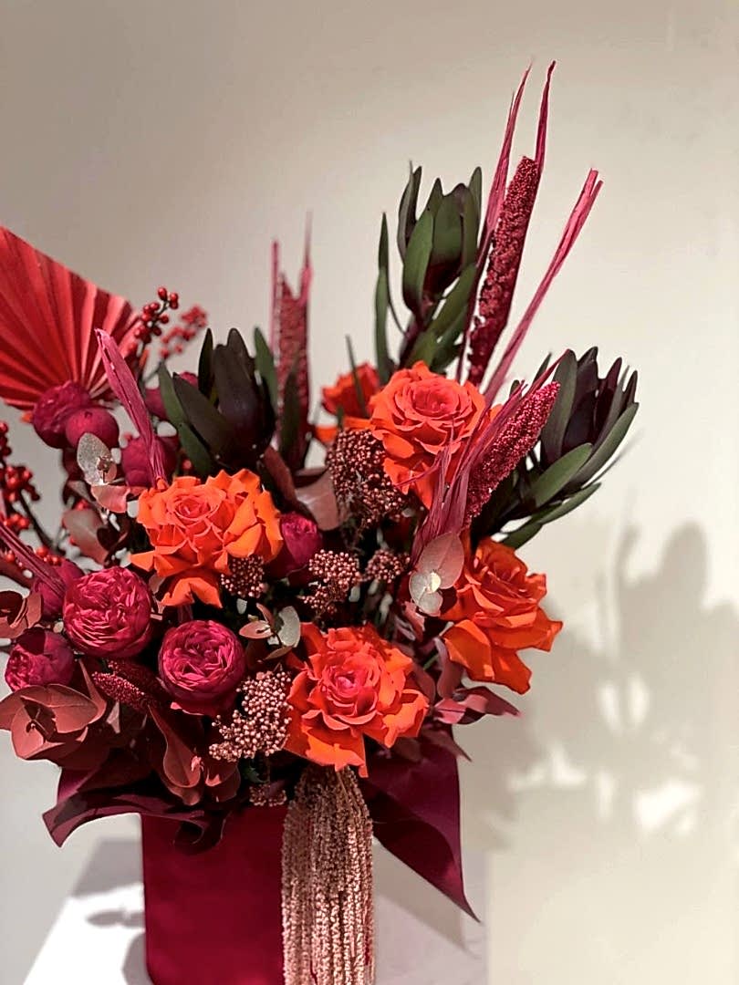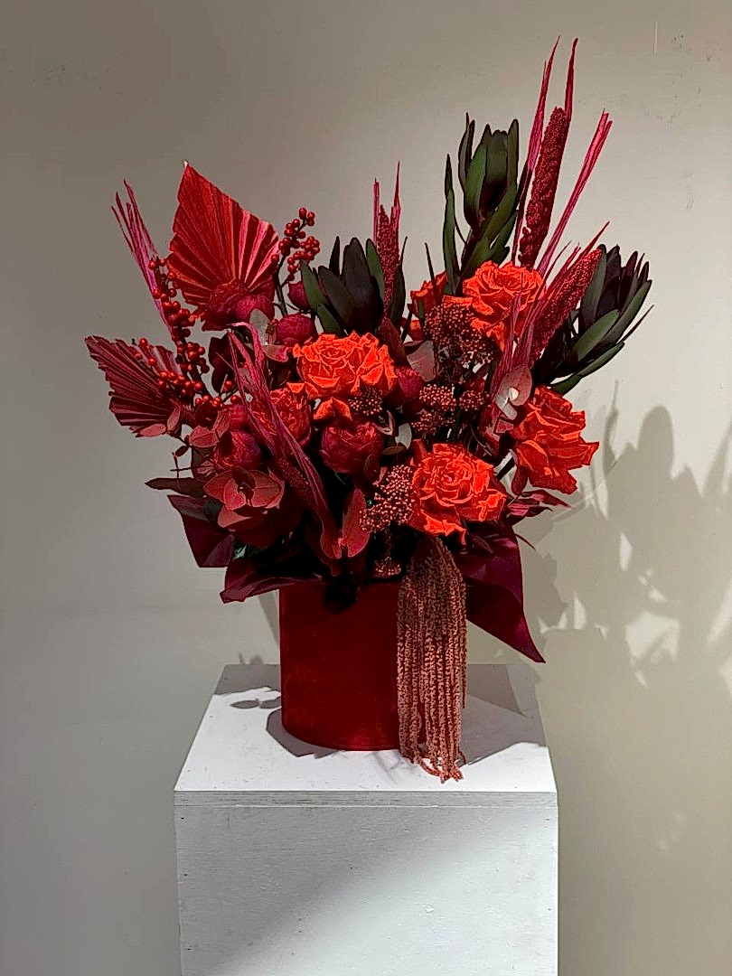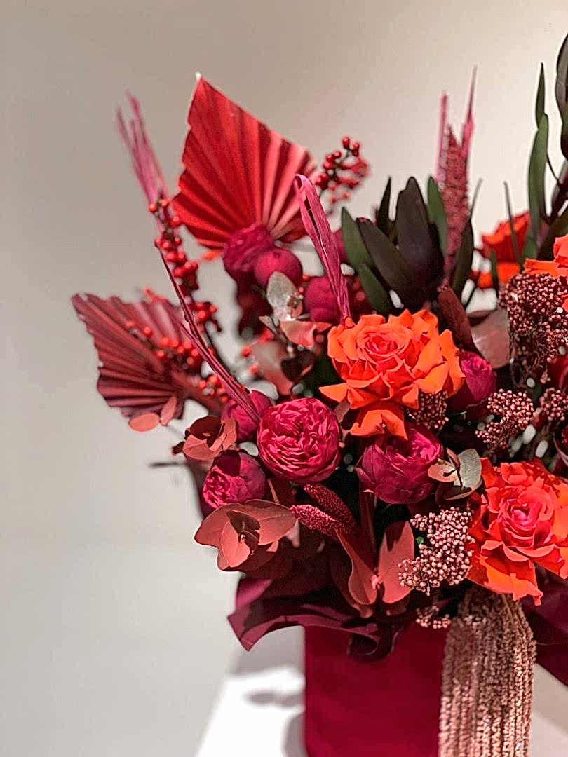 Роза Нина, Роза ред пиано, Илекс, эвкалипт, леукодендрон, остролистная пальма, амарант