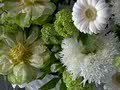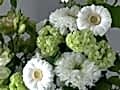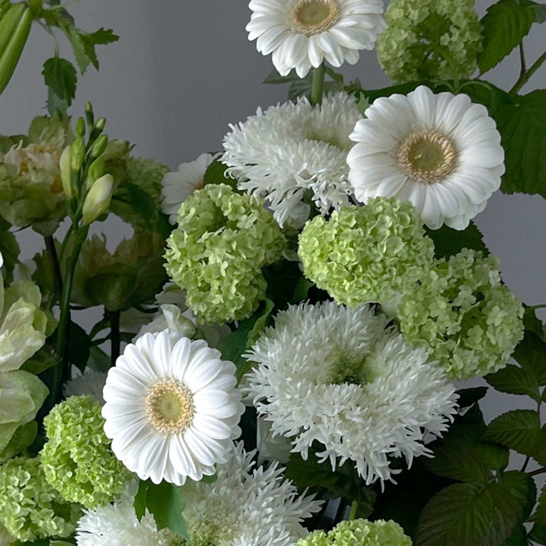 Состав: Гербера, Вибурнум, роза сорта Вегги, Лилия, хризантема сорта Этруско, Фрезия, Молюцела, веточки Малины, Альстромерия (на фото).