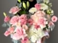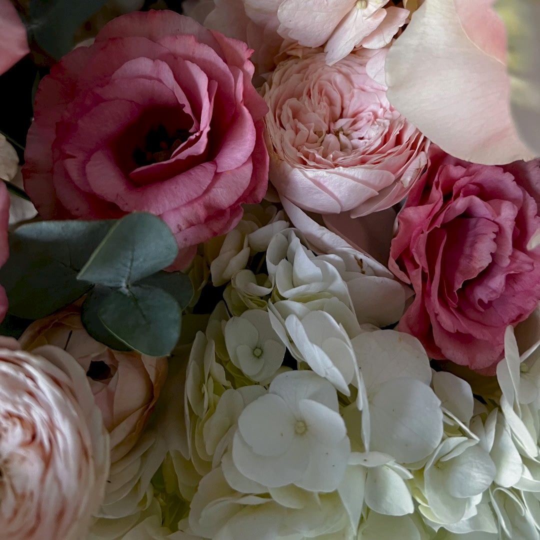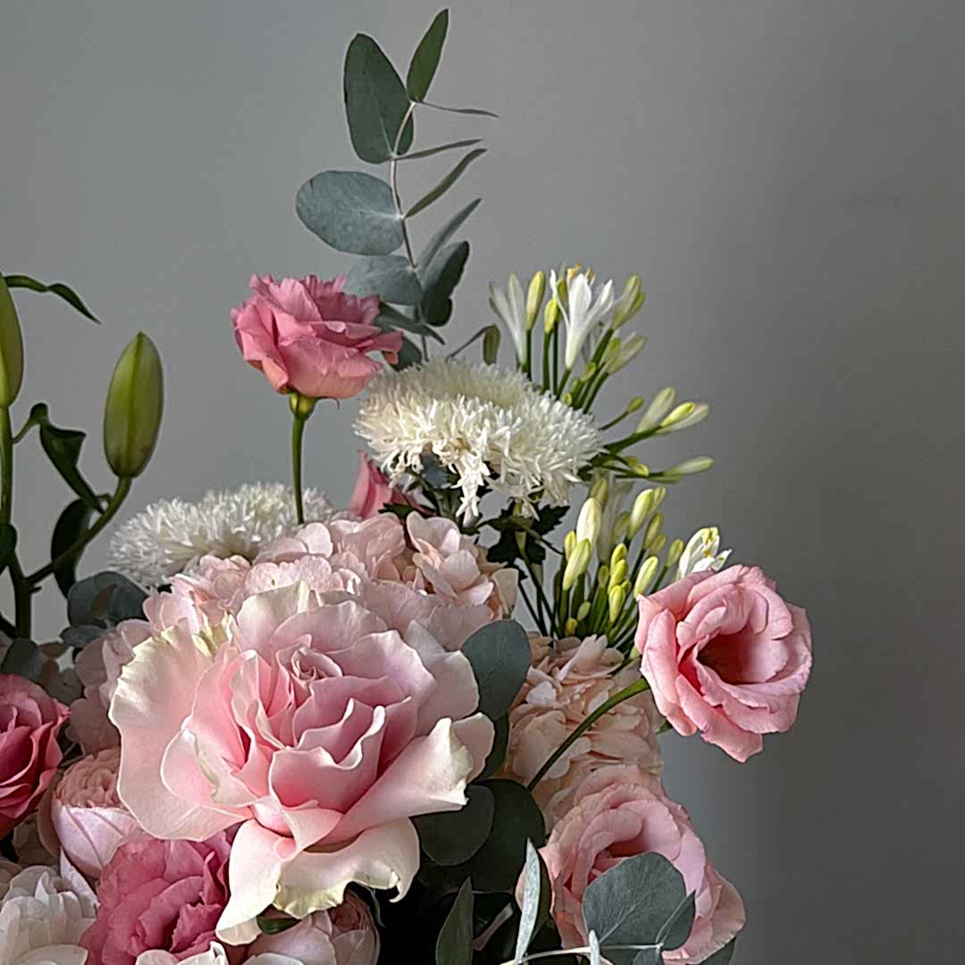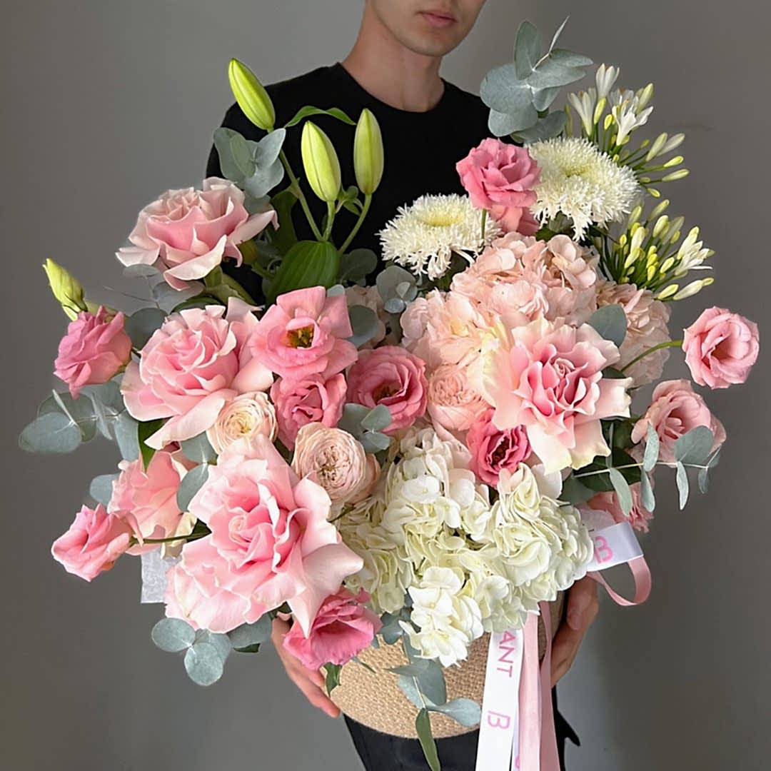 Состав: гортензия, лилия, хризантема сорта Этруско, эустома, агапантус, кустовая пионовидная роза сорта Менсфилд парк, роза сорта Пинк Мондиаль, веточки эвкалипта.