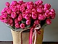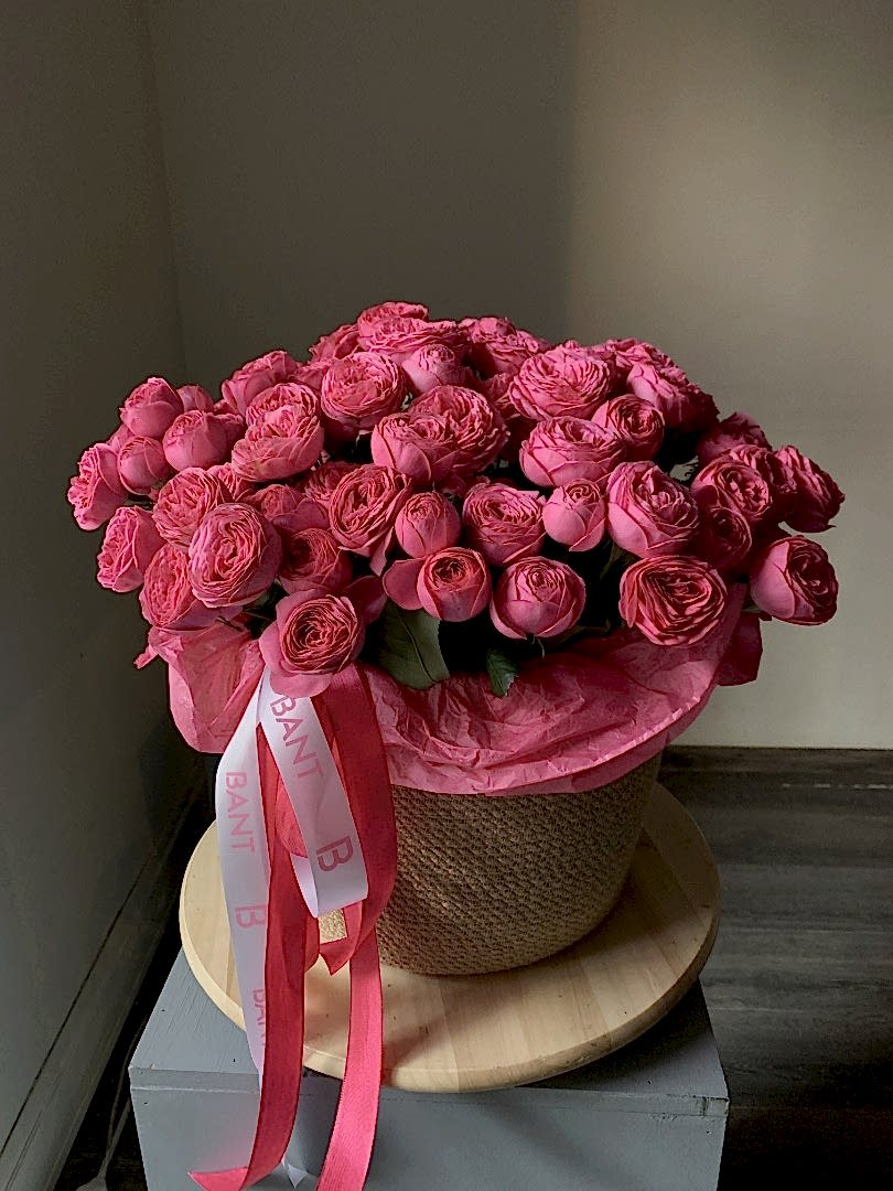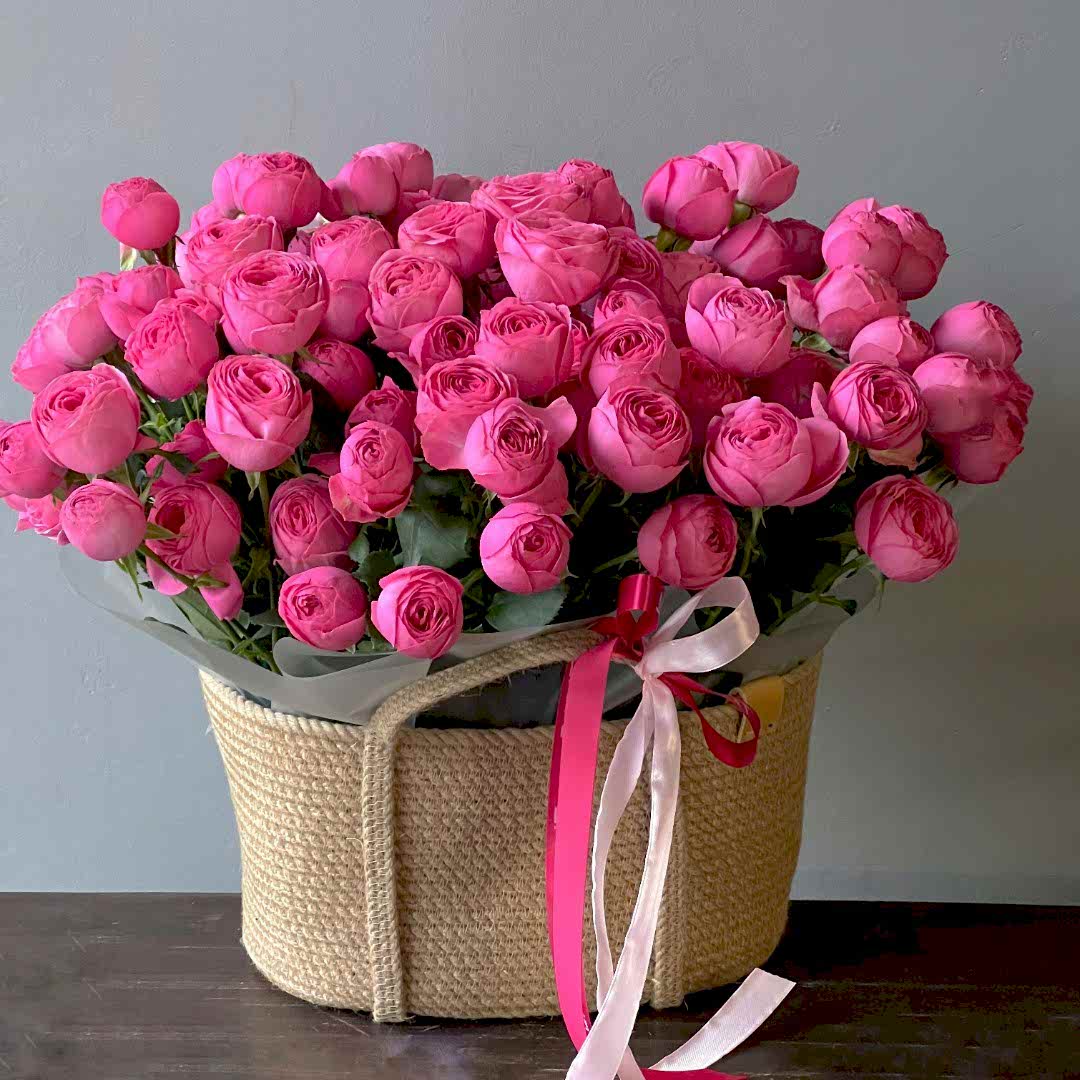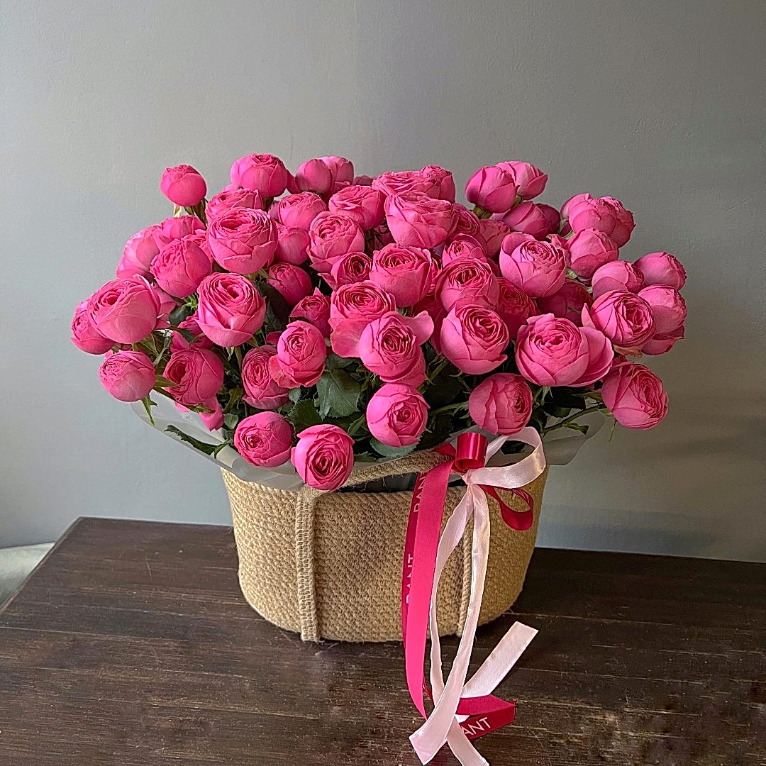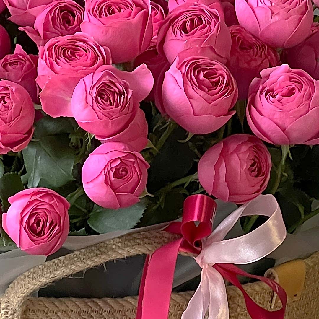 Состав: кустовая пионовидная роза Жизель (21 ветка на фото) и джутовая корзина.