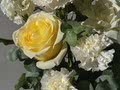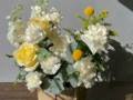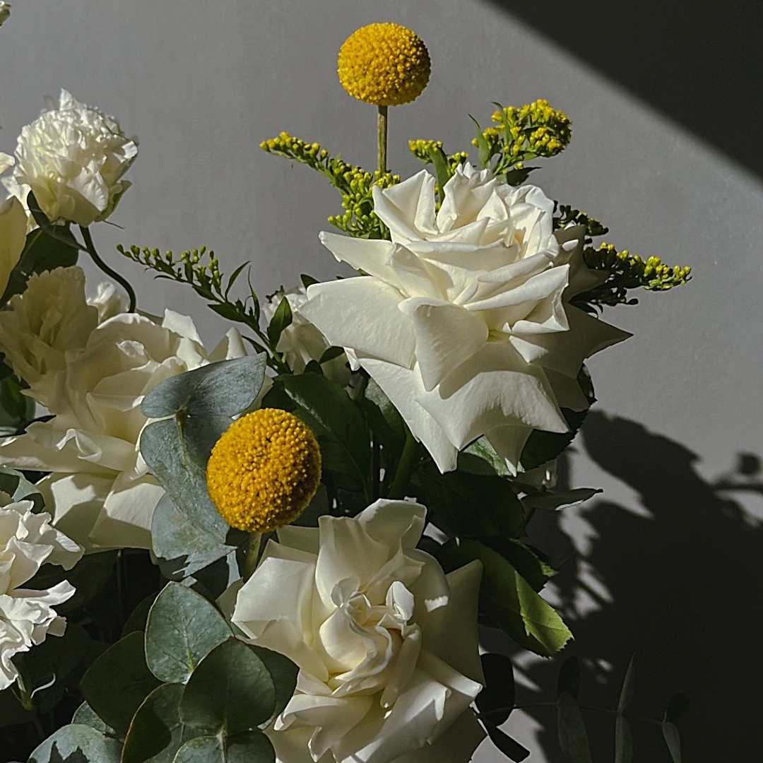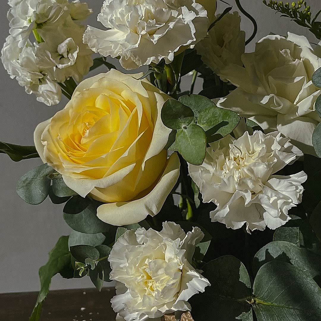 Состав: Маттиола 2 шт., Солидаго 1 шт. Эвкалипт цинерея 1 шт., Роза сорта Плая Бланка 3 шт., Роза сорта Кендл Лайт 2 шт., Краспедия 2 шт., диантус сорта Эверест 5 шт., лизиантус 1 шт.
