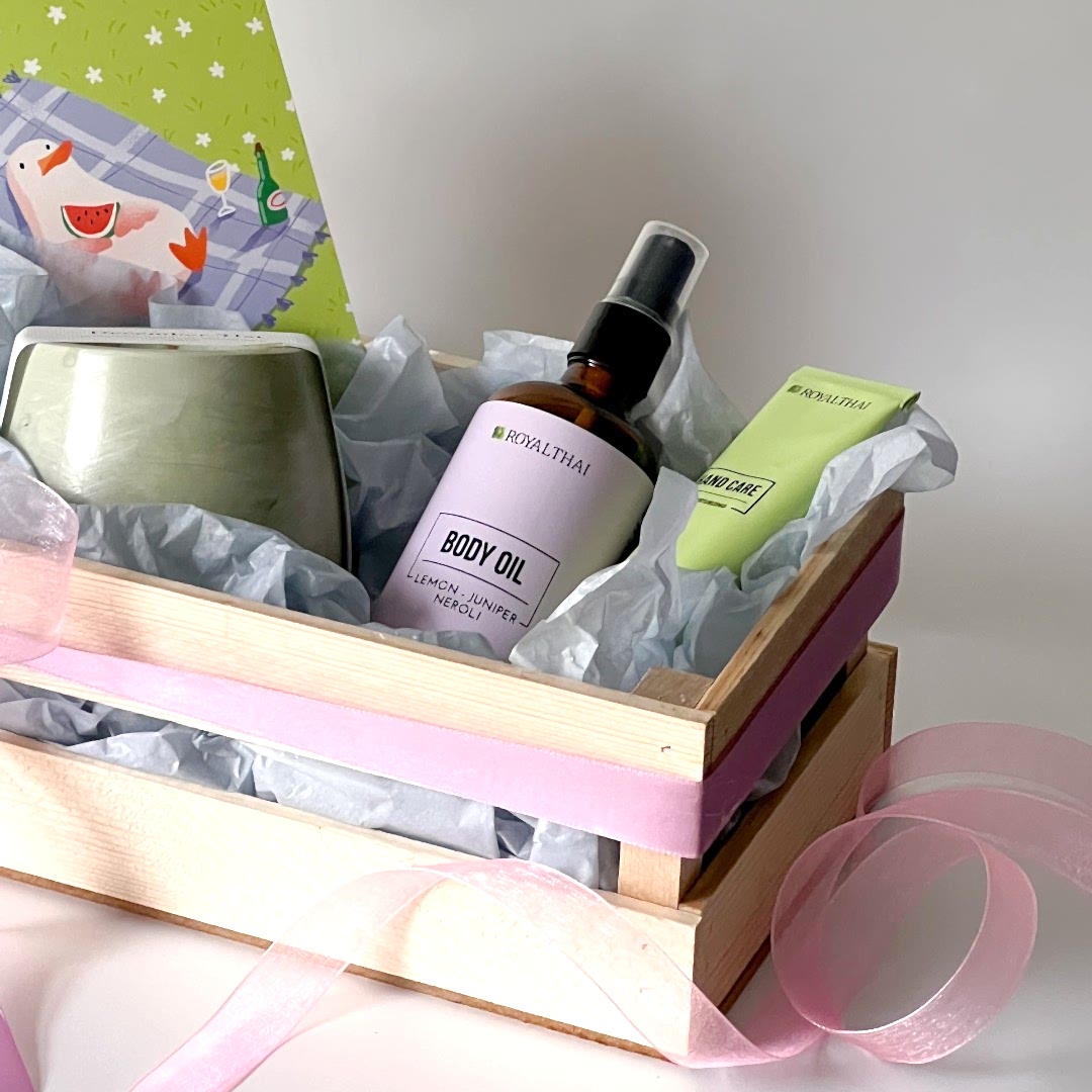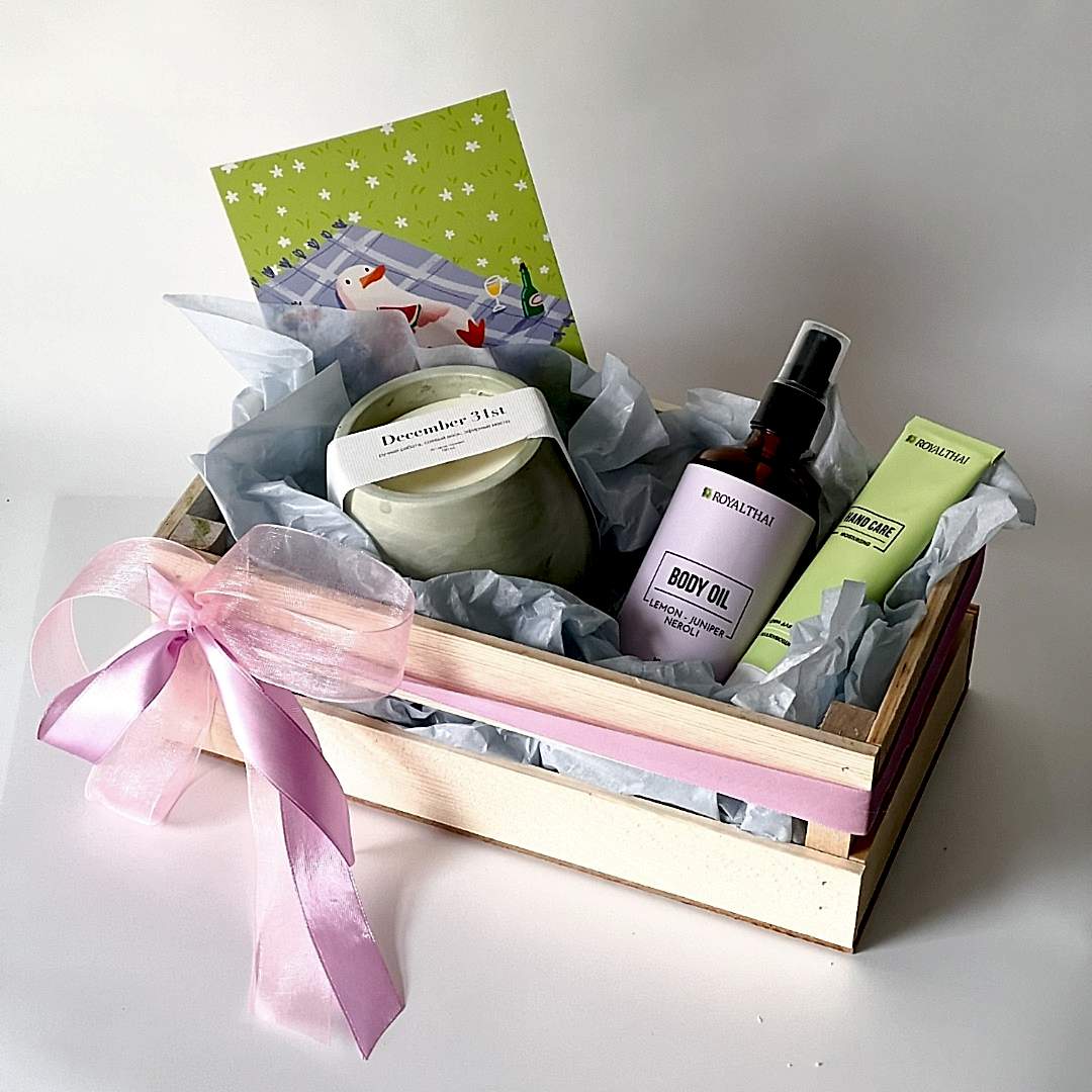 Состав: Свеча ароматическая ручной работы в гипсе, Масло для тела RoyalThai, Крем для рук RoyalThai, Открытка односторонняя на выбор. (на фото)