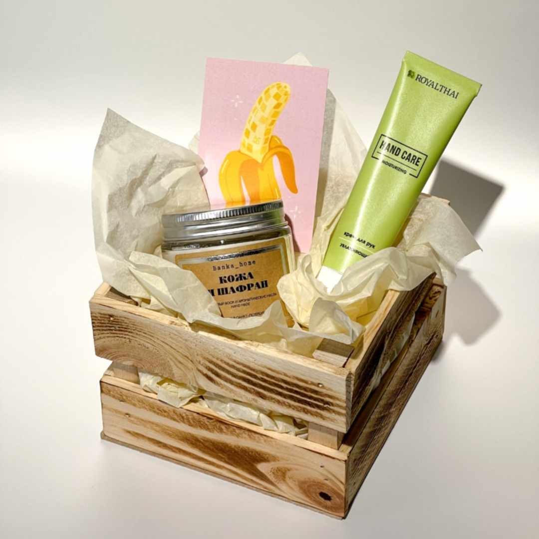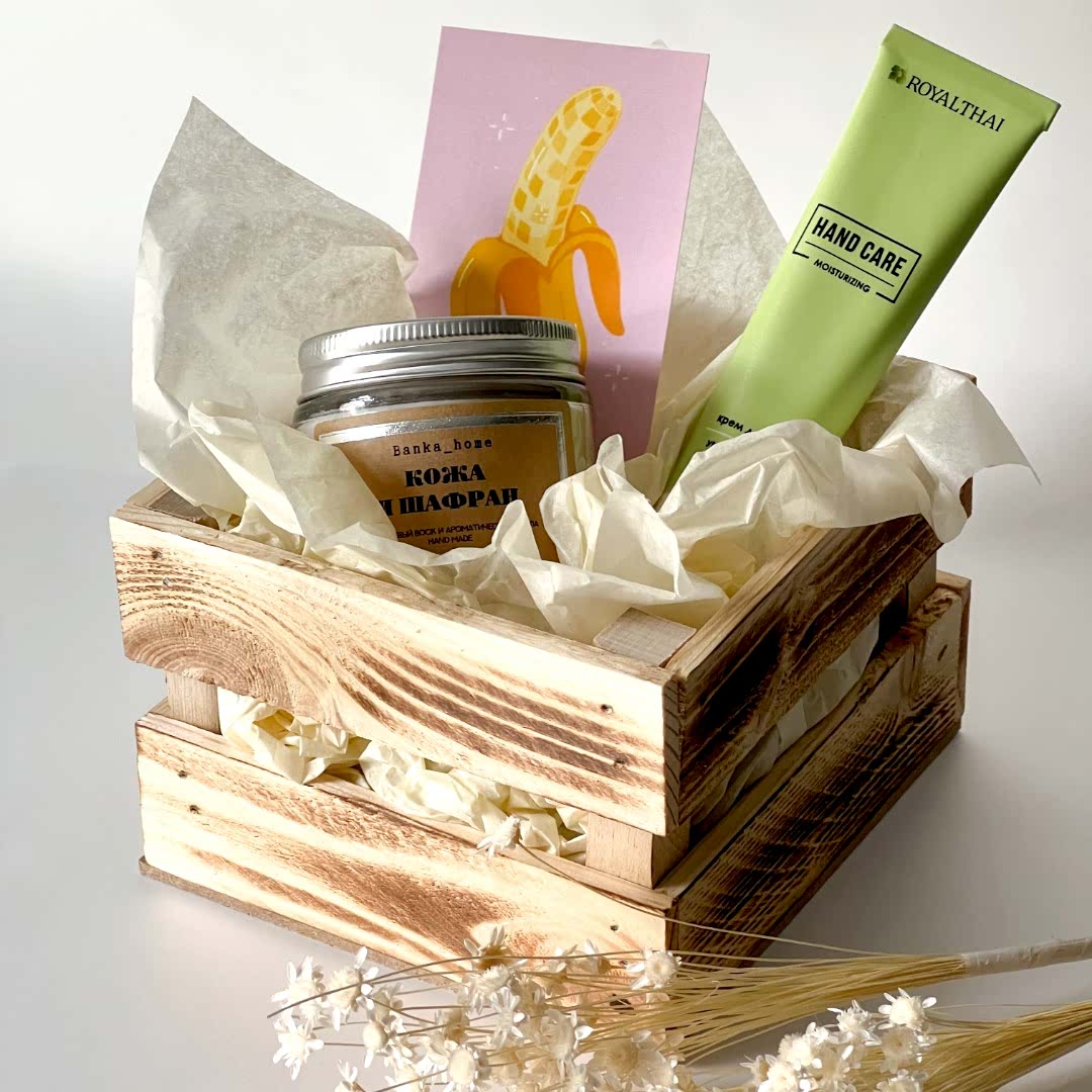 Состав: Свеча ручной работы Banka Home, Крем для рук RoyalThai, Мини-открытка на выбор (на фото).