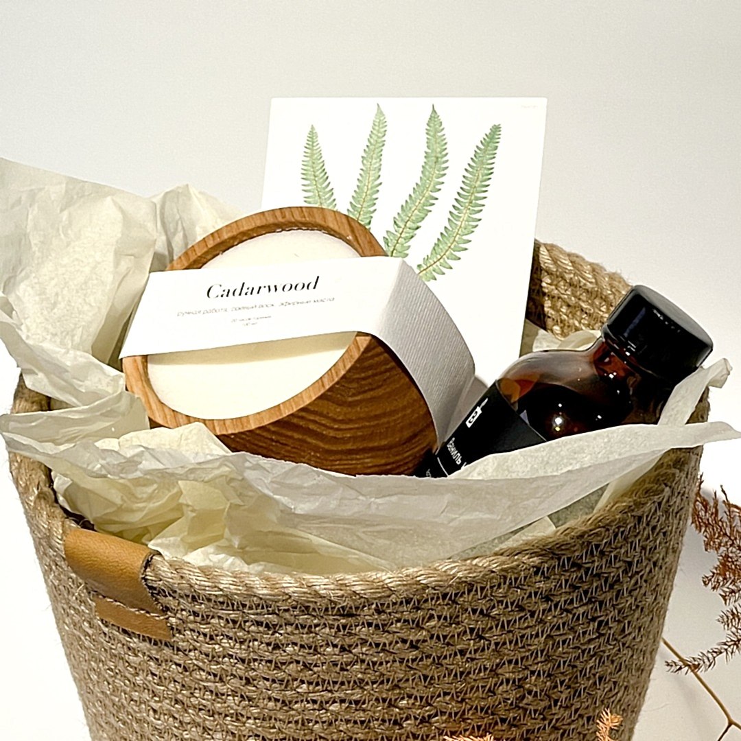 Состав: Свеча ароматическая ручной работы дерево, Диффузор BankaHome, Мини-открытка на выбор (на фото).